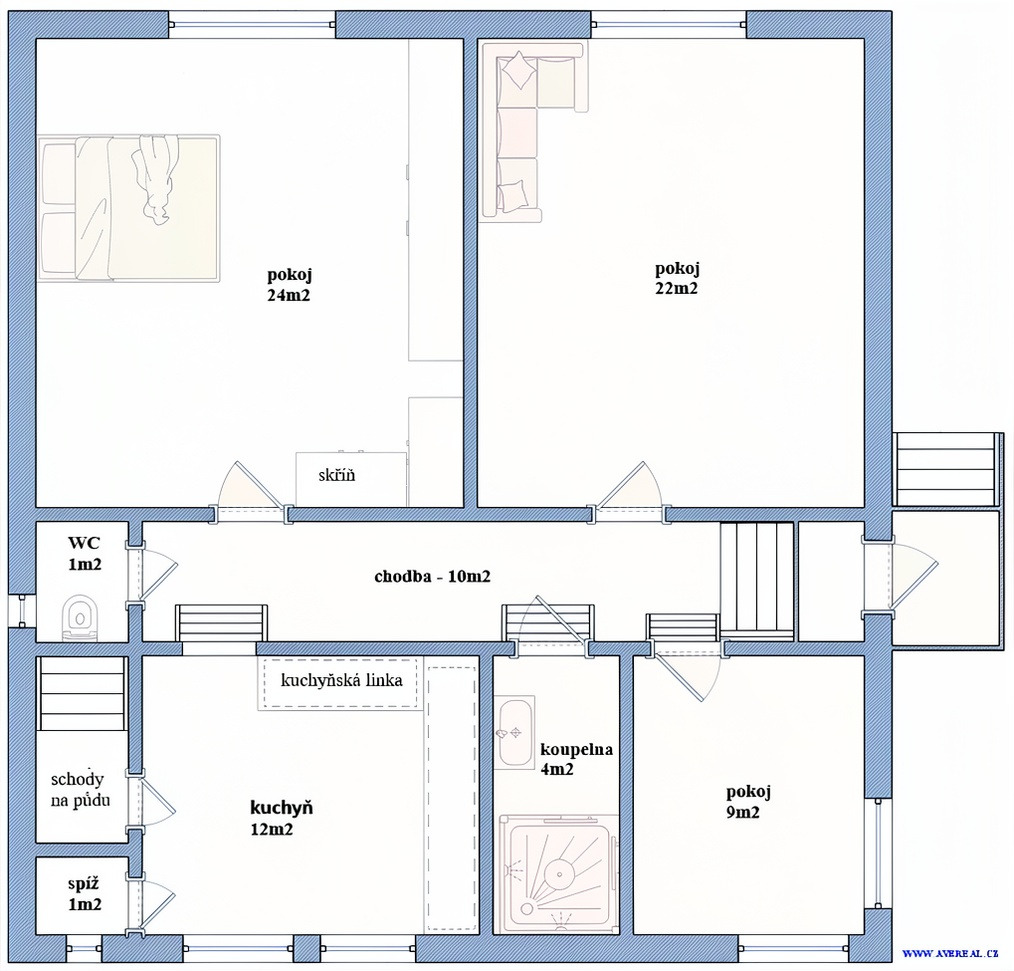 | Plocha bytu | cca 83m2 – dispozice domu zahrnuje prostorný obývací pokoj 22 m², hlavní ložnici 24 m², další pokoj 9 m², samostatnou kuchyň 12 m², koupelnu 4 m², oddělené WC 1 m², praktickou spíž 1 m² a centrální chodbu 10 m², což vytváří velmi funkční a příjemně uspořádaný obytný prostor. | ||